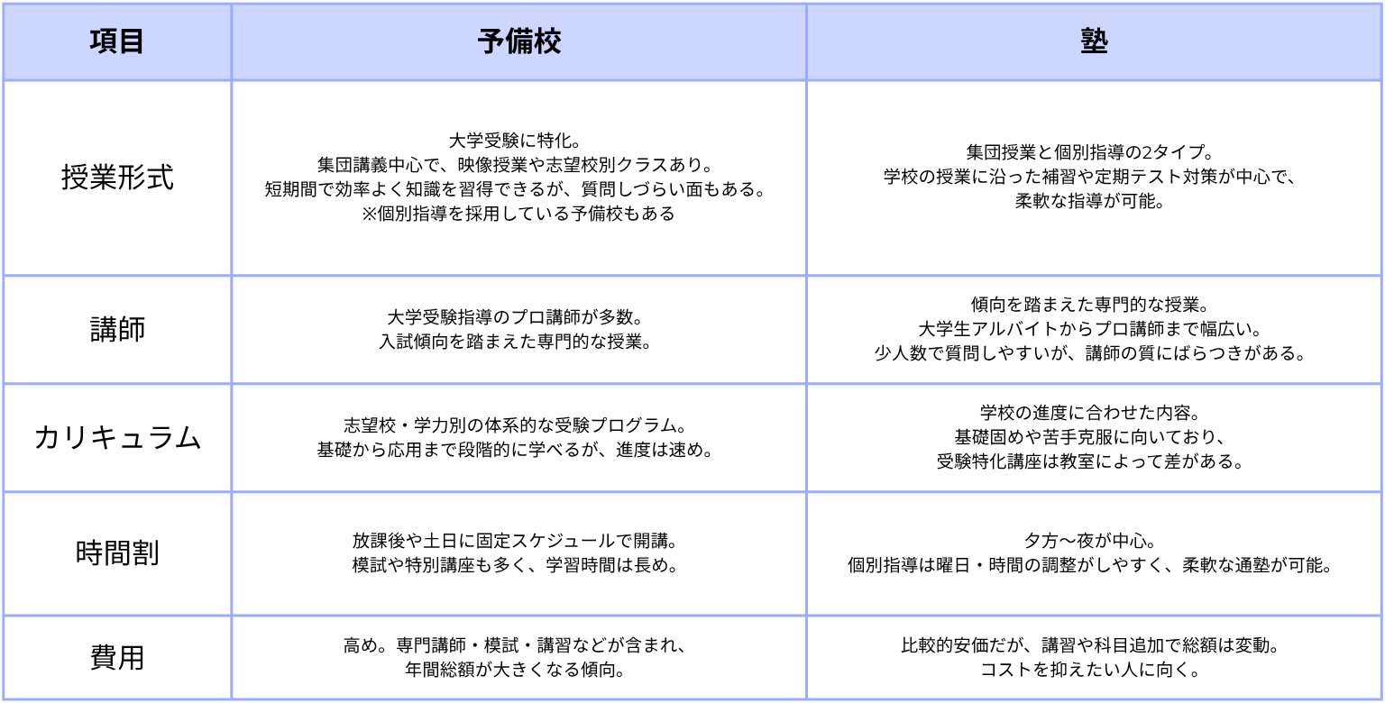 予備校と塾の違い【比較表】