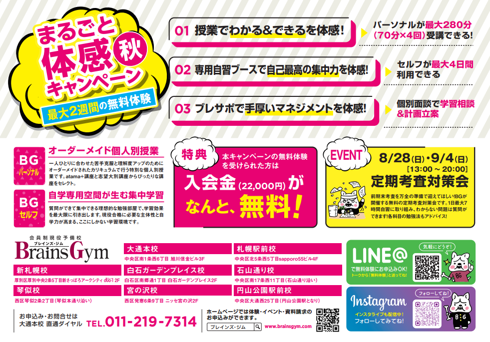 ぜひこの機会にブレインズ・ジムの会員制だからできる個人別指導、マネジメントの手厚さ、学習環境の良さを体感ください!
