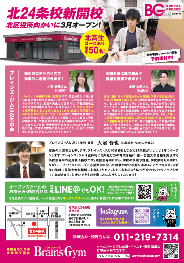 ブレインズ・ジム「北24条校」新開校!3/14(金)オープン!