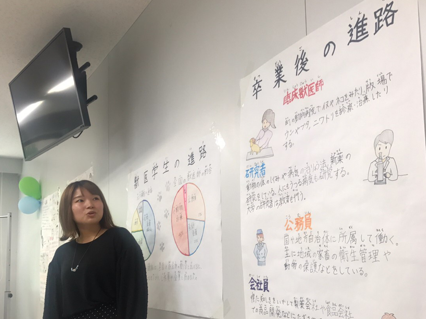 今年は講師の先生が在籍している学部の中から、薬学部、獣医学部、工学部建築、情報エレクトロニクス、文学部の研究室にお邪魔しました。研究室では、先生たちが普段どのようなことを学び将来はどのような仕事につながっていくのか、プレゼンしてもらいました。
